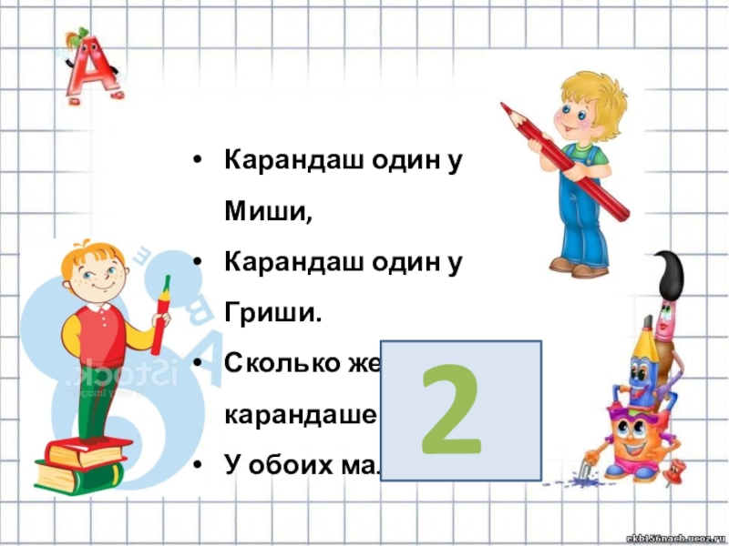 Карандаш один у Миши,Карандаш один у Гриши.Сколько же карандашейУ обоих малышей?2