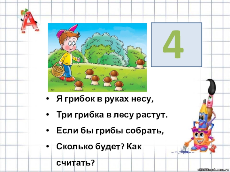 4Я грибок в руках несу,Три грибка в лесу растут.Если бы грибы собрать,Сколько будет? Как считать?