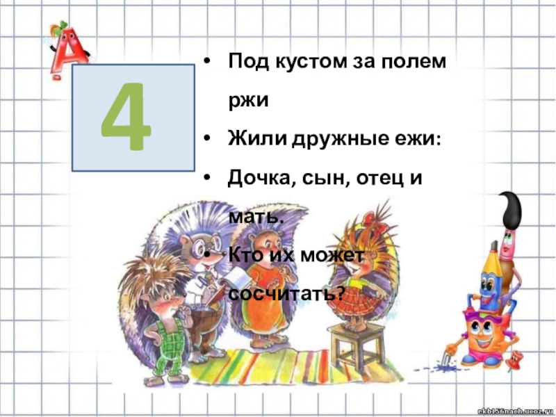 Под кустом за полем ржиЖили дружные ежи:Дочка, сын, отец и мать.Кто их может сосчитать?4