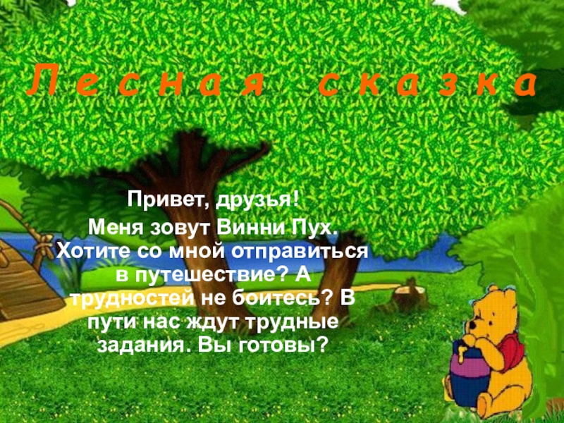 Меня зовут Винни Пух. Хотите со мной отправиться в путешествие? А трудностей не боитесь? В пути нас ждут трудные задания. Вы готовы?