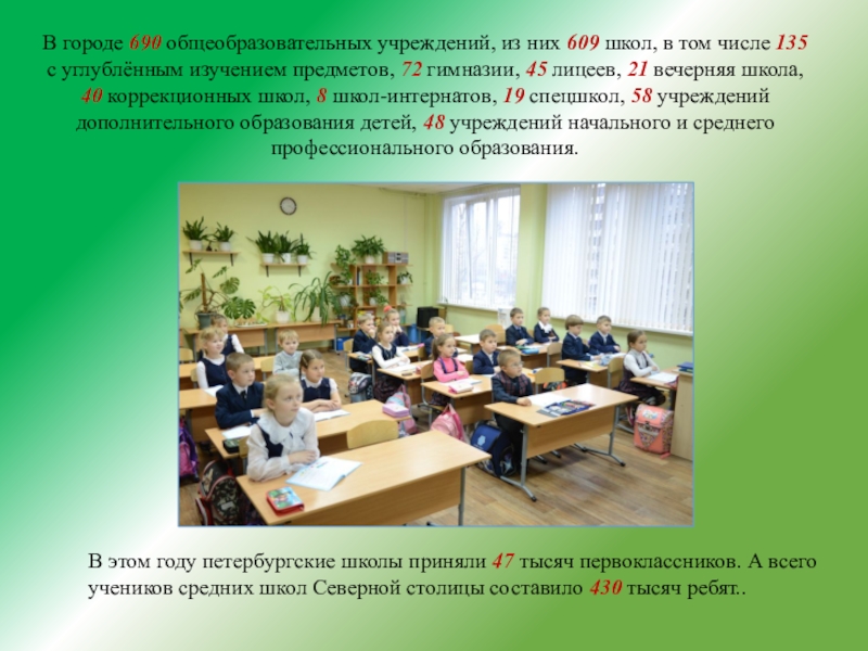 В этом году петербургские школы приняли 47 тысяч первоклассников. А всего учеников средних школ Северной столицы составило 430 тысяч ребят..