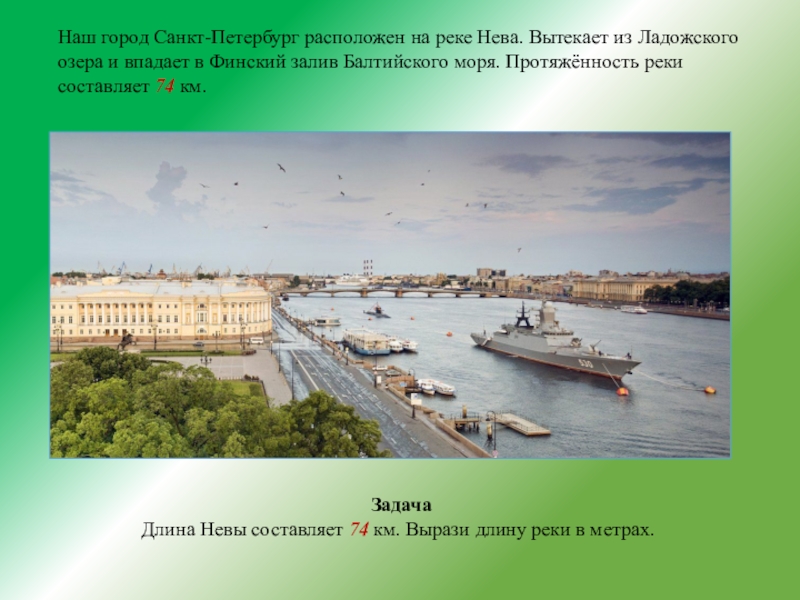 Длина Невы составляет 74 км. Вырази длину реки в метрах.