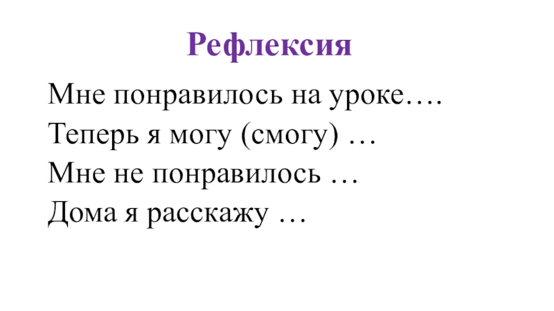 РефлексияМне понравилось на уроке….Теперь я могу (смогу) …Мне не понравилось …Дома я расскажу …