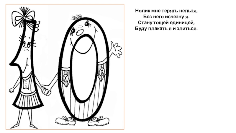 Слайд 2Нолик мне терять нельзя, Без него исчезну я. Стану тощей единицей, Буду плакать я