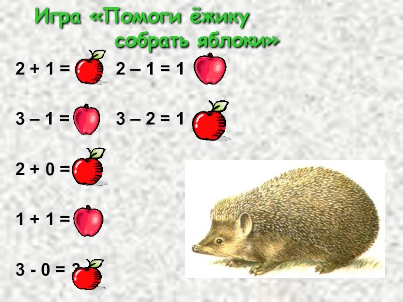 2 + 1 = 3 2 – 1 = 13 – 1 = 2 3 – 2 = 12 + 0 = 2 1 + 1 = 2 3 - 0 = 3 Игра «Помоги ёжику собрать яблоки»