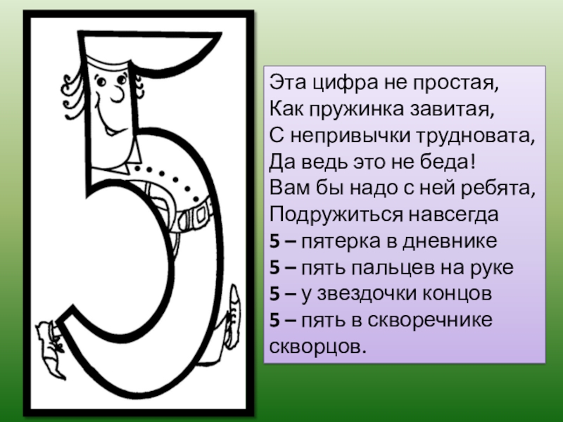 беда! Вам бы надо с ней ребята, Подружиться навсегда 5 – пятерка в дневнике 5 – пять пальцев на руке 5 – у звездочки концов 5 – пять в скворечнике скворцов.