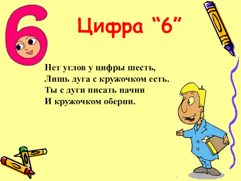 Цифра “6”Нет углов у цифры шесть,Лишь дуга с кружочком есть.Ты с дуги писать начниИ кружочком оберни.
