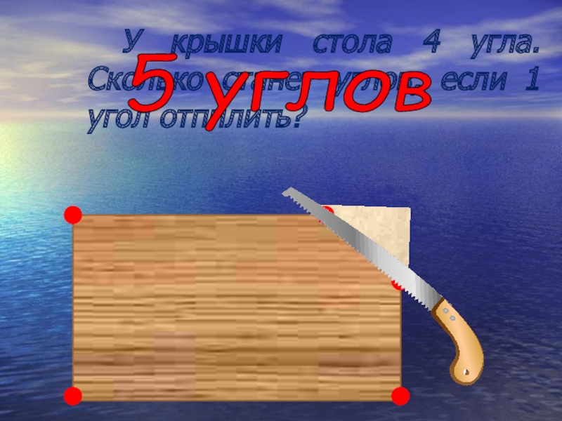 Слайд 2 У крышки стола 4 угла. Сколько станет углов, если 1 угол