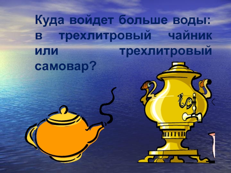 Слайд 3Куда войдет больше воды: в трехлитровый чайник или трехлитровый самовар?