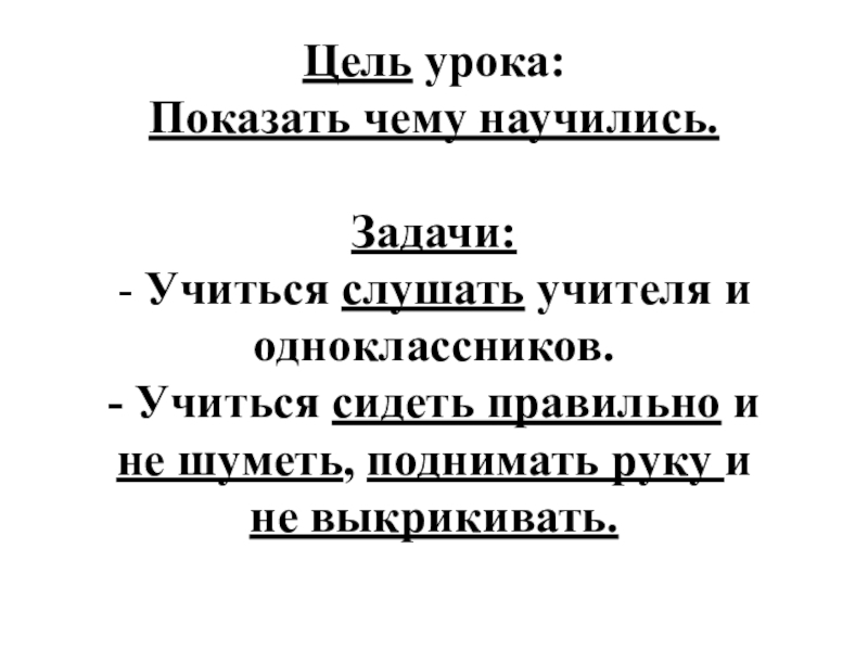 Цель урока: Показать чему научились. Задачи: - Учиться слушать учителя и одноклассников. - Учиться сидеть правильно и не шуметь, поднимать руку и не выкрикивать.