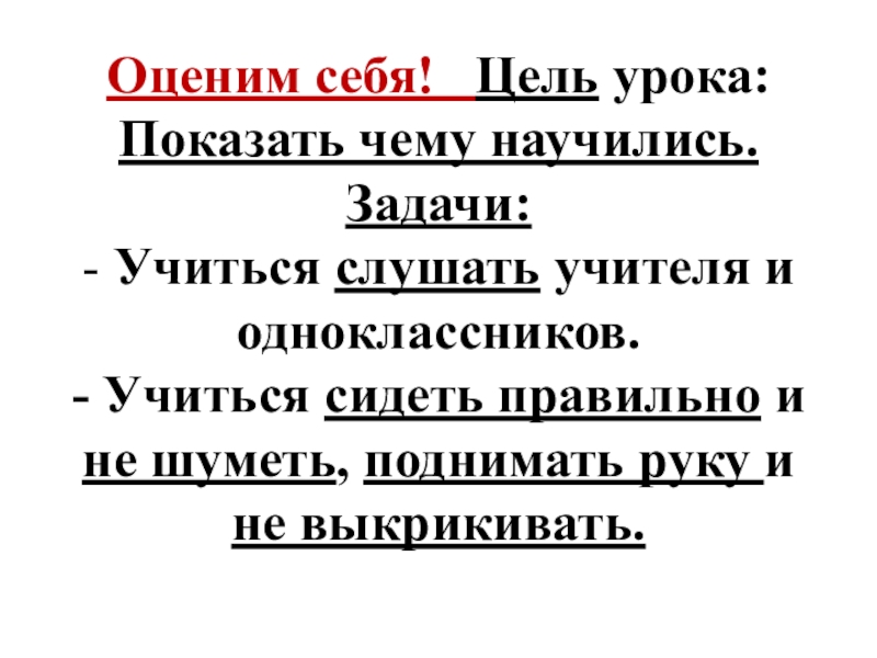 Оценим себя!  Цель урока: Показать чему научились. Задачи: - Учиться слушать учителя и одноклассников. - Учиться