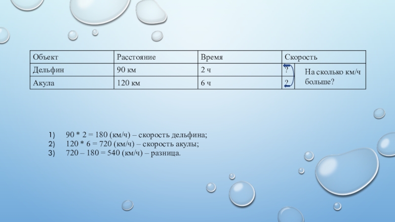 Слайд 1490 * 2 = 180 (км/ч) – скорость дельфина;