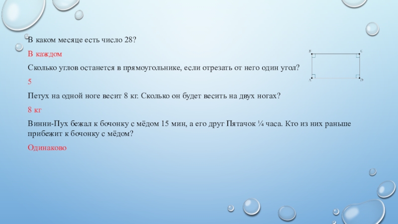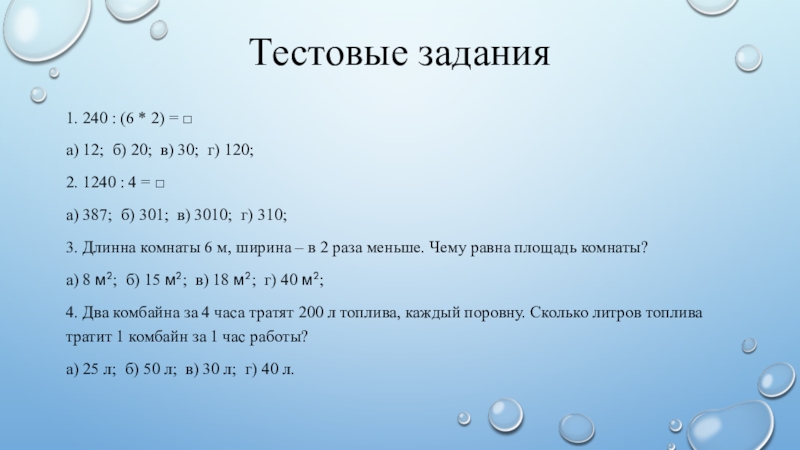 3. Длинна комнаты 6 м, ширина – в 2 раза меньше. Чему равна площадь комнаты?