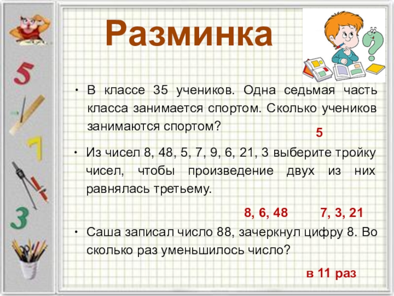 Из чисел 8, 48, 5, 7, 9, 6, 21, 3 выберите тройку чисел, чтобы произведение двух из них равнялась третьему.