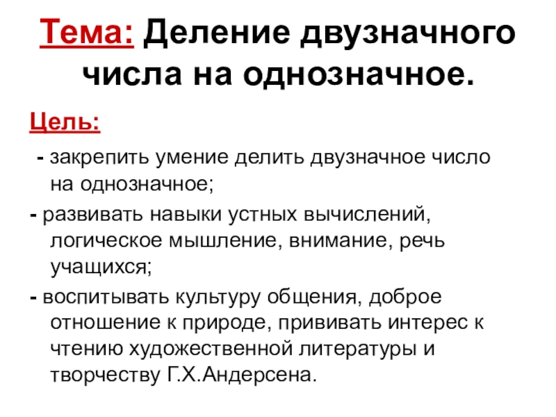 - воспитывать культуру общения, доброе отношение к природе, прививать интерес к чтению художественной литературы и творчеству Г.Х.Андерсена.
