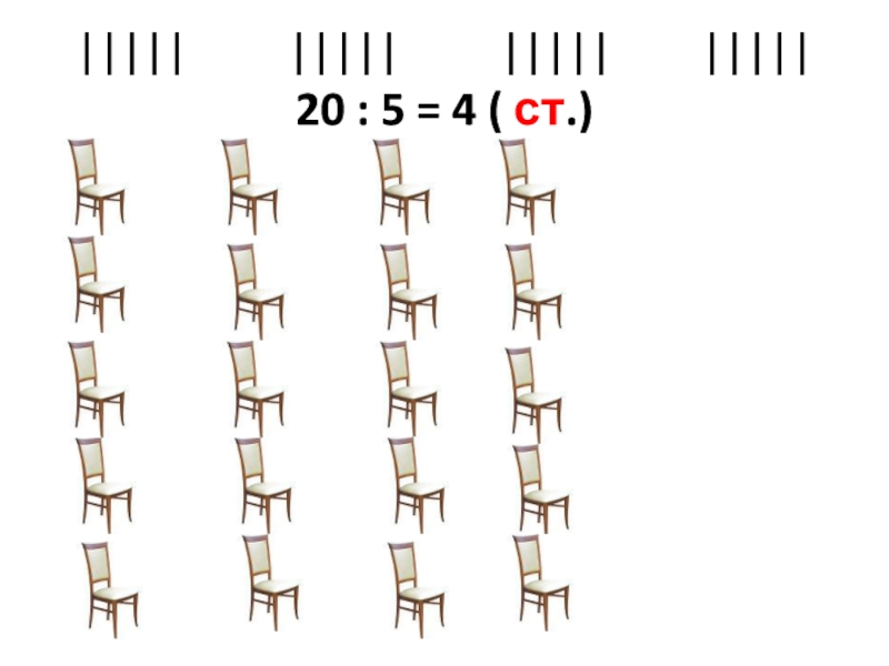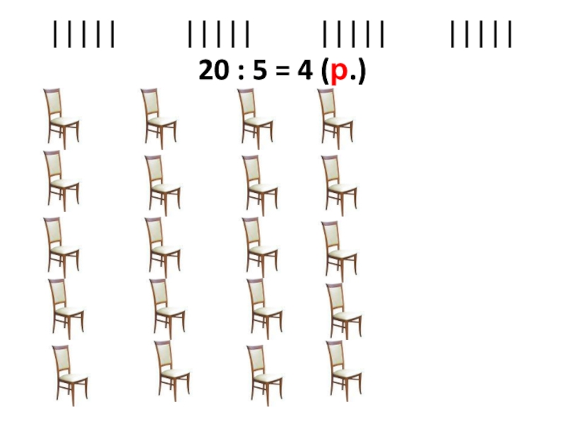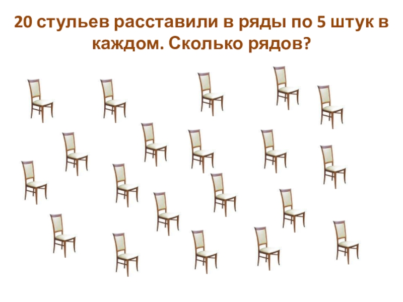 Слайд 820 стульев расставили в ряды по 5 штук в каждом. Сколько