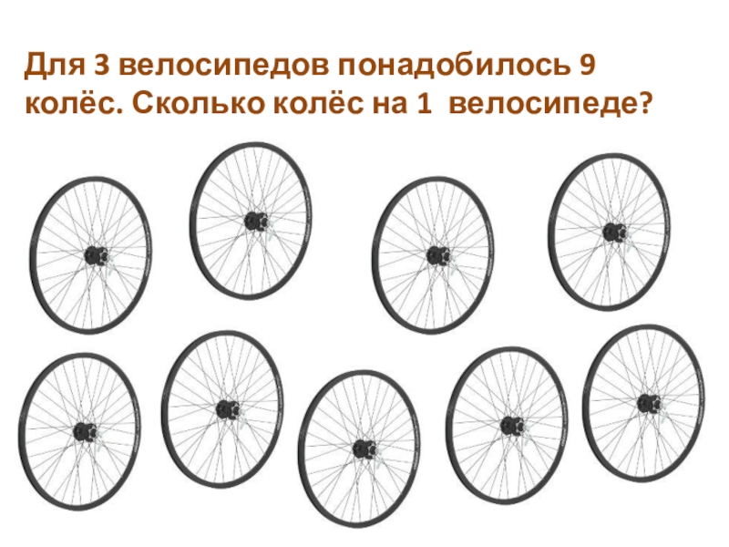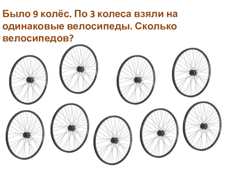 Слайд 14Было 9 колёс. По 3 колеса взяли на одинаковые велосипеды. Сколько