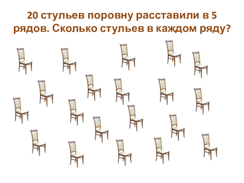 Слайд 620 стульев поровну расставили в 5 рядов. Сколько стульев в каждом