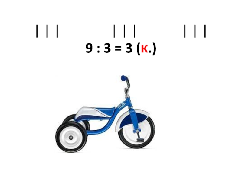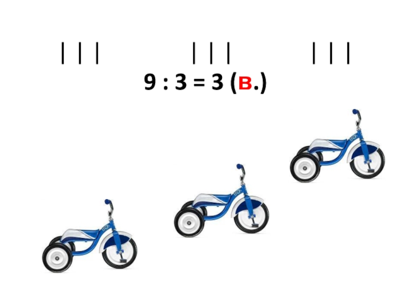 Было 9 колёс. По 3 колеса взяли на одинаковые велосипеды. Сколько велосипедов?