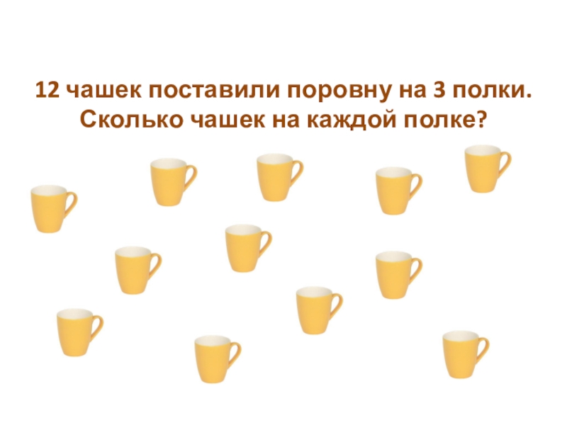 Слайд 2 12 чашек поставили поровну на 3 полки. Сколько чашек на каждой