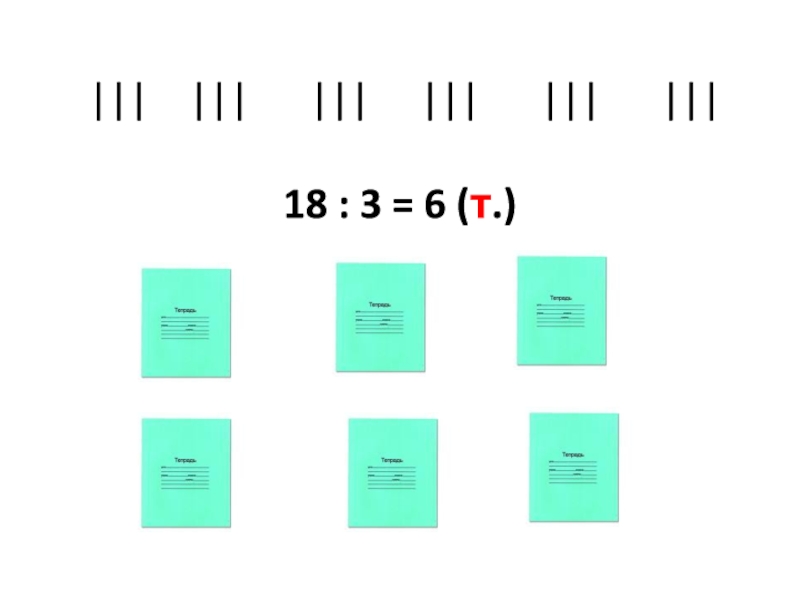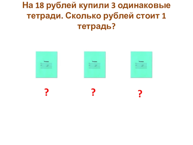 Слайд 10На 18 рублей купили 3 одинаковые тетради. Сколько рублей стоит 1