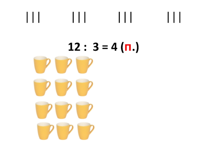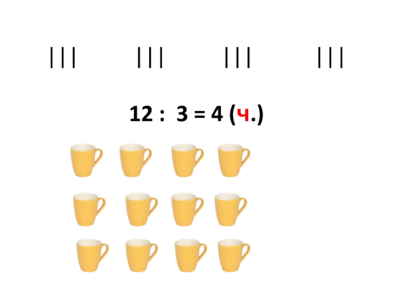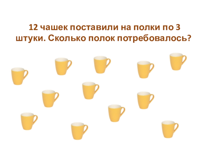 Слайд 4 12 чашек поставили на полки по 3 штуки. Сколько полок
