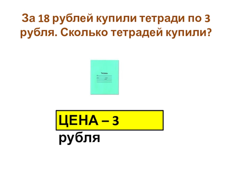 За 18 рублей купили тетради по 3 рубля. Сколько тетрадей купили? ЦЕНА – 3 рубля