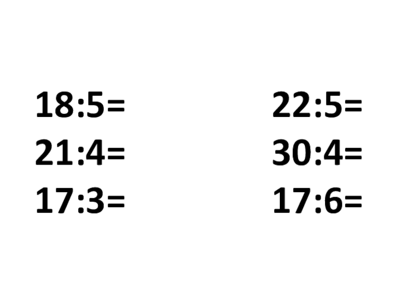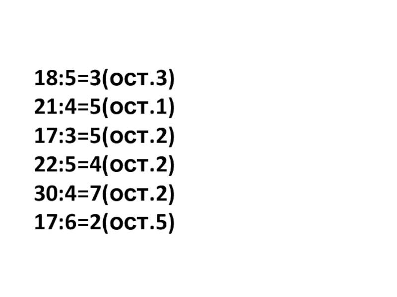 18:5=3(ост.3)  21:4=5(ост.1)       17:3=5(ост.2)   22:5=4(ост.2) 30:4=7(ост.2) 17:6=2(ост.5)