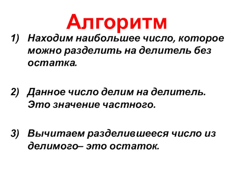 АлгоритмНаходим наибольшее число, которое можно разделить на делитель без остатка.Данное число делим на делитель. Это значение частного.Вычитаем