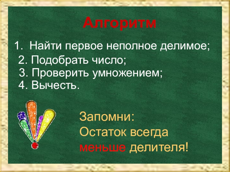 Алгоритм Найти первое неполное делимое; Запомни: Остаток всегда меньше делителя!2. Подобрать число;3. Проверить умножением;4. Вычесть.