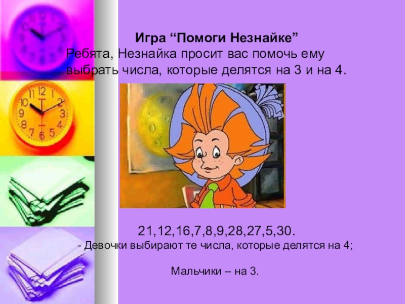 Ребята, Незнайка просит вас помочь ему выбрать числа, которые делятся на 3 и на 4.