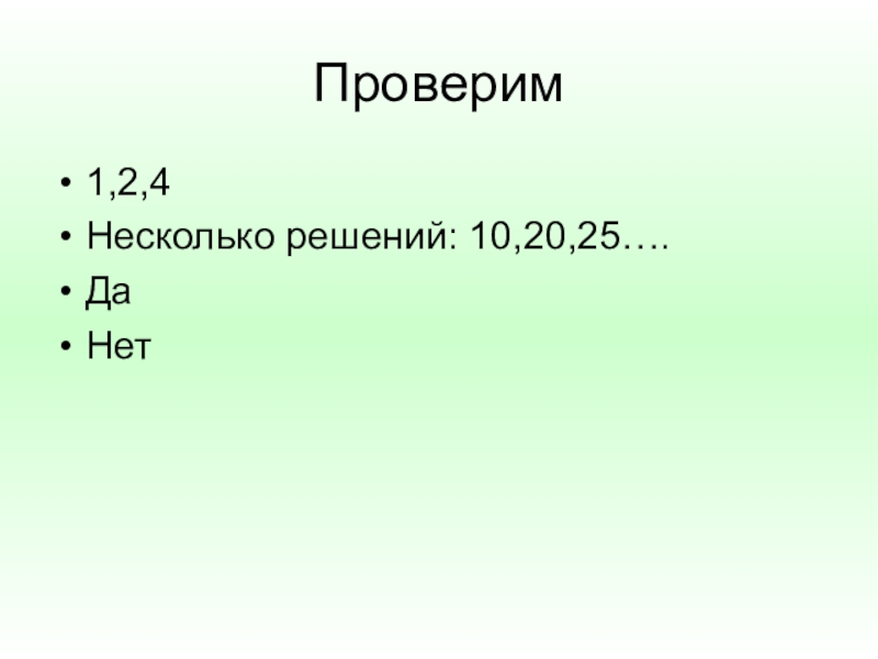 Проверим1,2,4Несколько решений: 10,20,25….ДаНет