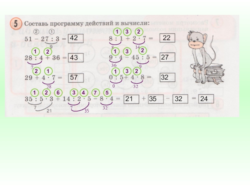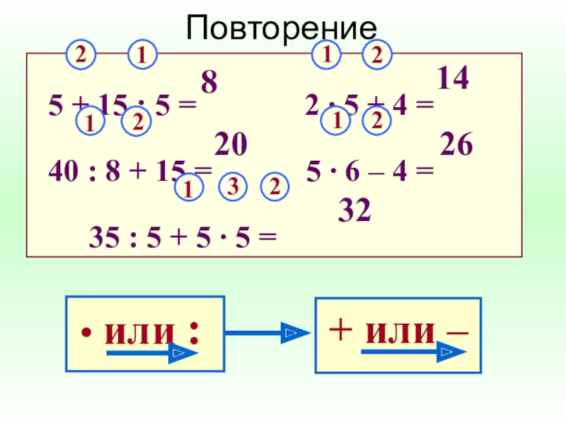 40 : 8 + 15 = 5 ∙ 6 – 4 =