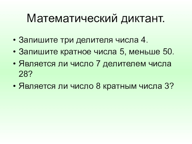 Математический диктант.Запишите три делителя числа 4.Запишите кратное числа 5, меньше 50.Является ли число 7 делителем числа 28?Является