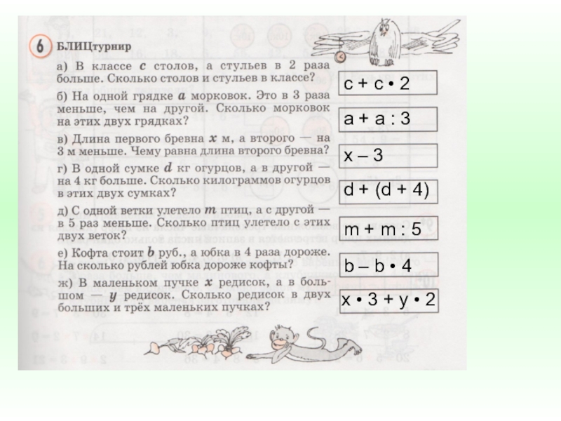 c + c • 2a + a : 3x – 3 d + (d + 4)m +
