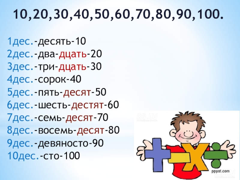 10,20,30,40,50,60,70,80,90,100.1дес.-десять-102дес.-два-дцать-203дес.-три-дцать-304дес.-сорок-405дес.-пять-десят-506дес.-шесть-дестят-607дес.-семь-десят-708дес.-восемь-десят-809дес.-девяносто-9010дес.-сто-100