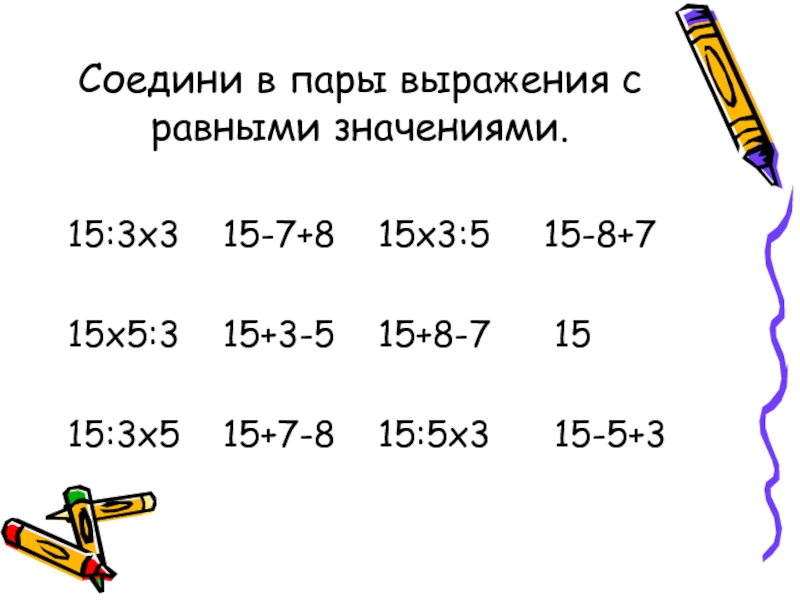 Соедини в пары выражения с равными значениями.15:3x3  15-7+8  15x3:5   15-8+715x5:3  15+3-5