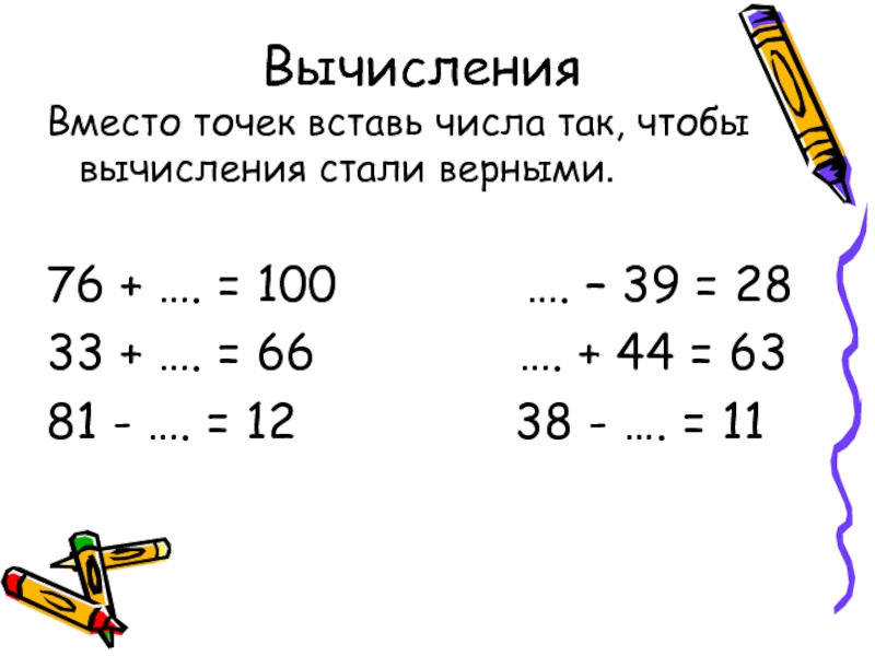 ВычисленияВместо точек вставь числа так, чтобы вычисления стали верными.76 + …. = 100 …. – 39 = 2833 + …. = 66 …. +
