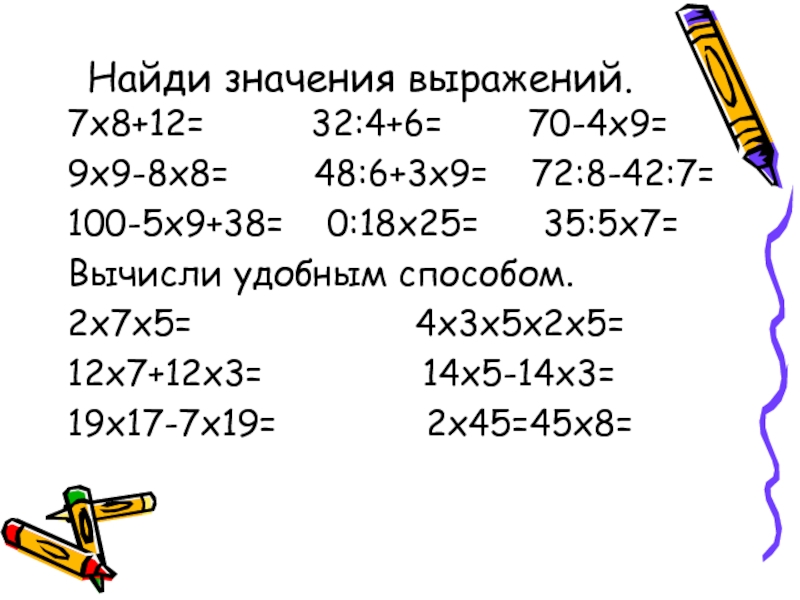 Найди значения выражений.7x8+12=     32:4+6=    70-4x9=9x9-8x8=    48:6+3x9=
