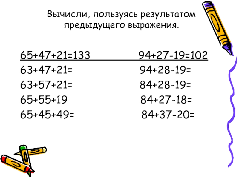 Вычисли, пользуясь результатом предыдущего выражения.65+47+21=133        94+27-19=10263+47+21=