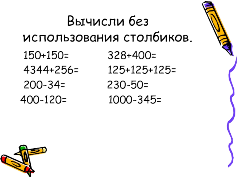 Вычисли без использования столбиков. 150+150=      328+400= 4344+256=     125+125+125=