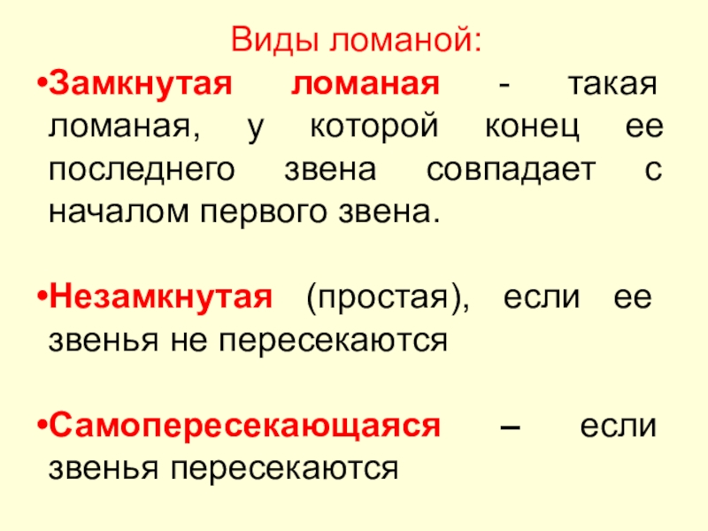 Виды ломаной:Замкнутая ломаная - такая ломаная, у которой конец ее последнего звена совпадает с началом первого звена.Незамкнутая
