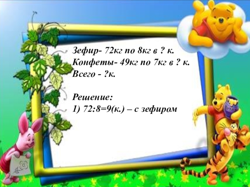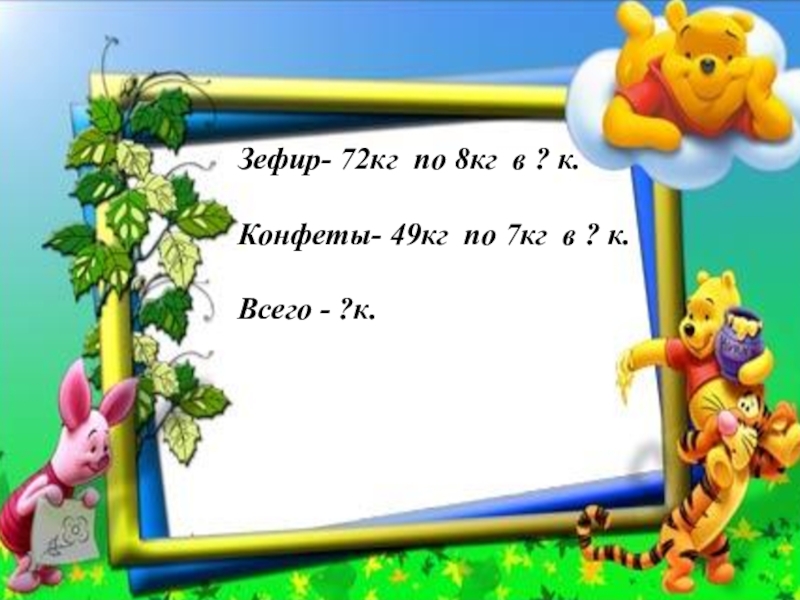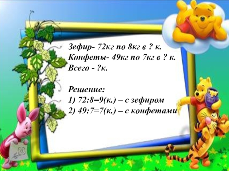Слайд 33 Зефир- 72кг по 8кг в ? к. Конфеты- 49кг по 7кг в