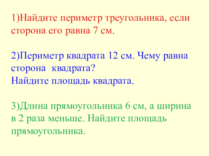 1)Найдите периметр треугольника, если сторона его равна 7 см.2)Периметр квадрата 12 см. Чему равна сторона квадрата? Найдите
