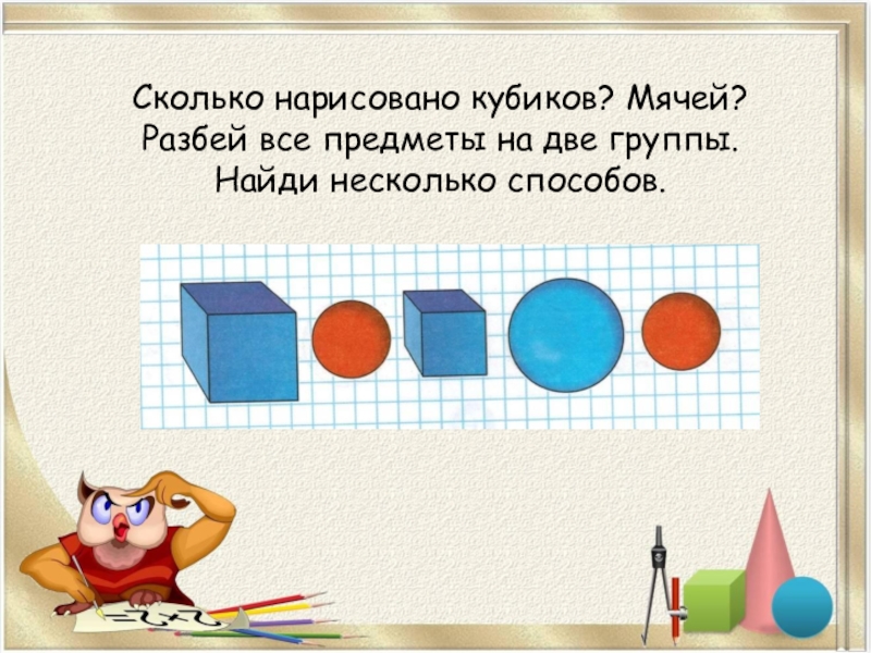 Сколько нарисовано кубиков? Мячей? Разбей все предметы на две группы.Найди несколько способов.