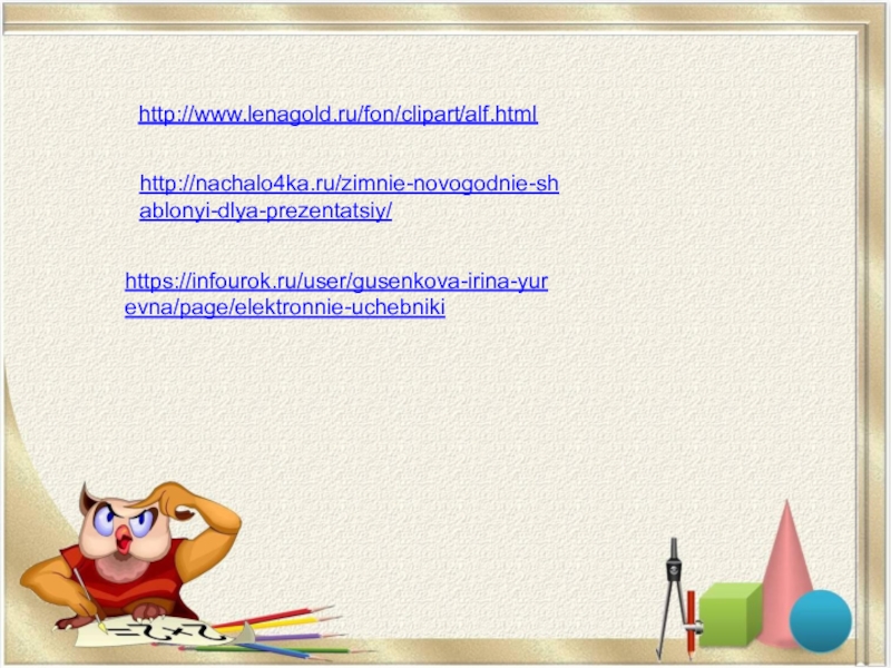 http://www.lenagold.ru/fon/clipart/alf.htmlhttp://nachalo4ka.ru/zimnie-novogodnie-shablonyi-dlya-prezentatsiy/https://infourok.ru/user/gusenkova-irina-yurevna/page/elektronnie-uchebniki
