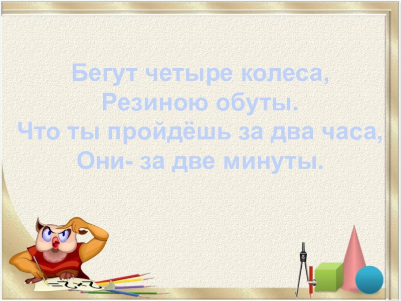Бегут четыре колеса,Резиною обуты.Что ты пройдёшь за два часа,Они- за две минуты.