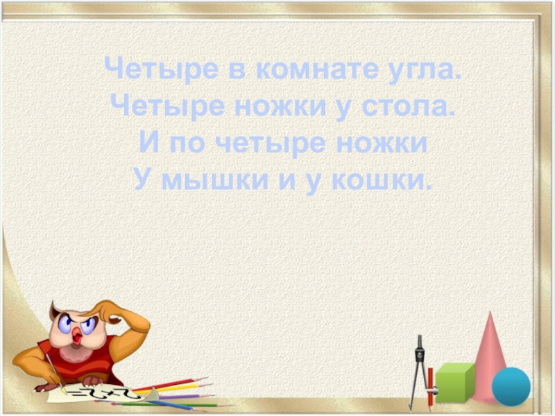 Четыре в комнате угла.Четыре ножки у стола.И по четыре ножкиУ мышки и у кошки.