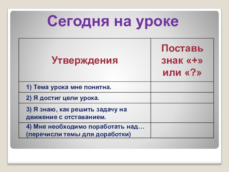 2) научиться решать задачи на движение с отставанием.
