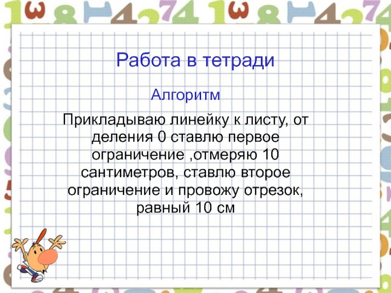 Работа в тетрадиАлгоритмПрикладываю линейку к листу, от деления 0 ставлю первое ограничение ,отмеряю 10 сантиметров, ставлю второе